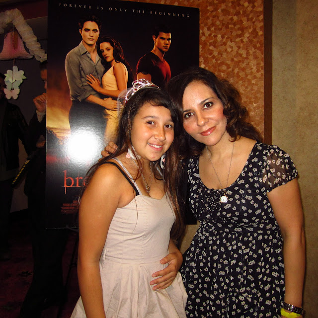 Anoche, decenas de fanáticos de la serie del Crepúsculo en Los Angeles, Miami, y New York celebraron la boda más anticipada del año. A través de varios medios, entre ellos este blog “Checalamovie” los fans fueron invitados a un pre-estreno muy especial de Summit Entertainment’s “The Twilight Saga: Breaking Dawn – Part I”. En Los Angeles en donde tuve la oportunidad de asistir les cuento que los invitados, todos entusiastas y luciendo sus mejores galas, pasaron una noche de lujo en un ambiente de boda ya que el teatro del cine fuer transformado en una sala de recepción. Desde la entrada a la sala donde se exhibió la cinta; los pasillos decorados con Luminarias, campanas de boda, pétalos color de rosa y por supuesto no podía faltar el pastel de bodas de Bella y Edward. Toda la decoración inspirada en la serie del Crepúsculo. También a las niñas se les dió su coronita de novia.. ¡Lindísimas!