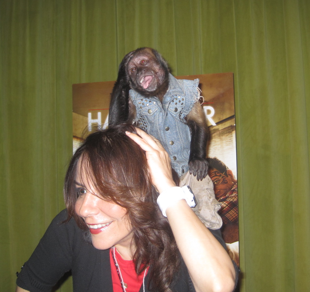 Hoy tuve la oportunidad de reunirme con su entrenador, Thomas Gunderson, quien estuvo durante cada segundo del rodaje de “Hangover II” y me contó algunos detalles interesantes. La reunión se llevó a cabo en Arenas Group en la ciudad de Burbank, CA. Crystal es literalmente un estuche de monerías. Para empezar este animalito actor cuenta con 14 años y medio de experiencia en el medio. ¡Wow!. Y la verdad actúa casi como humano en la cinta; yo juraba que era un varoncito, pero ya en persona, me di cuenta que aún en los animales, la feminidad aflora; le encanta posar para las cámaras mostrando su simpática sonrisa, abrazar, dar besitos bastante efusivos y jalarte de los cabellos. ¡Muy juguetona!