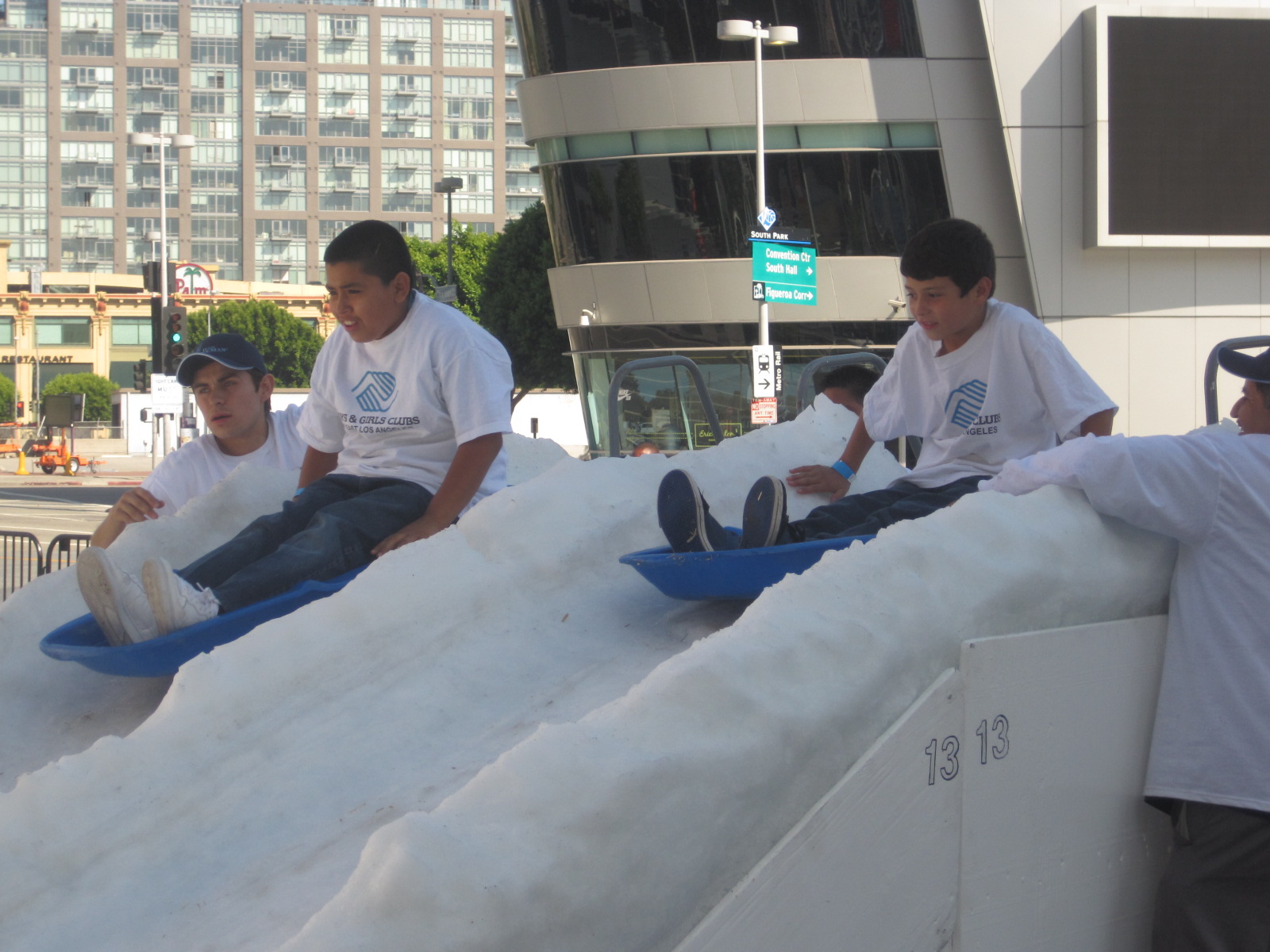 Una impresionante visita del Polo Sur al centro de Los Angeles en pleno verano sorprendió a quienes recorrían el área. ¡Todo se visito de blanco¡ Había esculturas de hielo, y no lo van a creer, pero hasta mini toboganes o resbaladeras de hielo; si, de las que hay en las estaciones de ski, increíble, para la diversión de chicos y grandes.